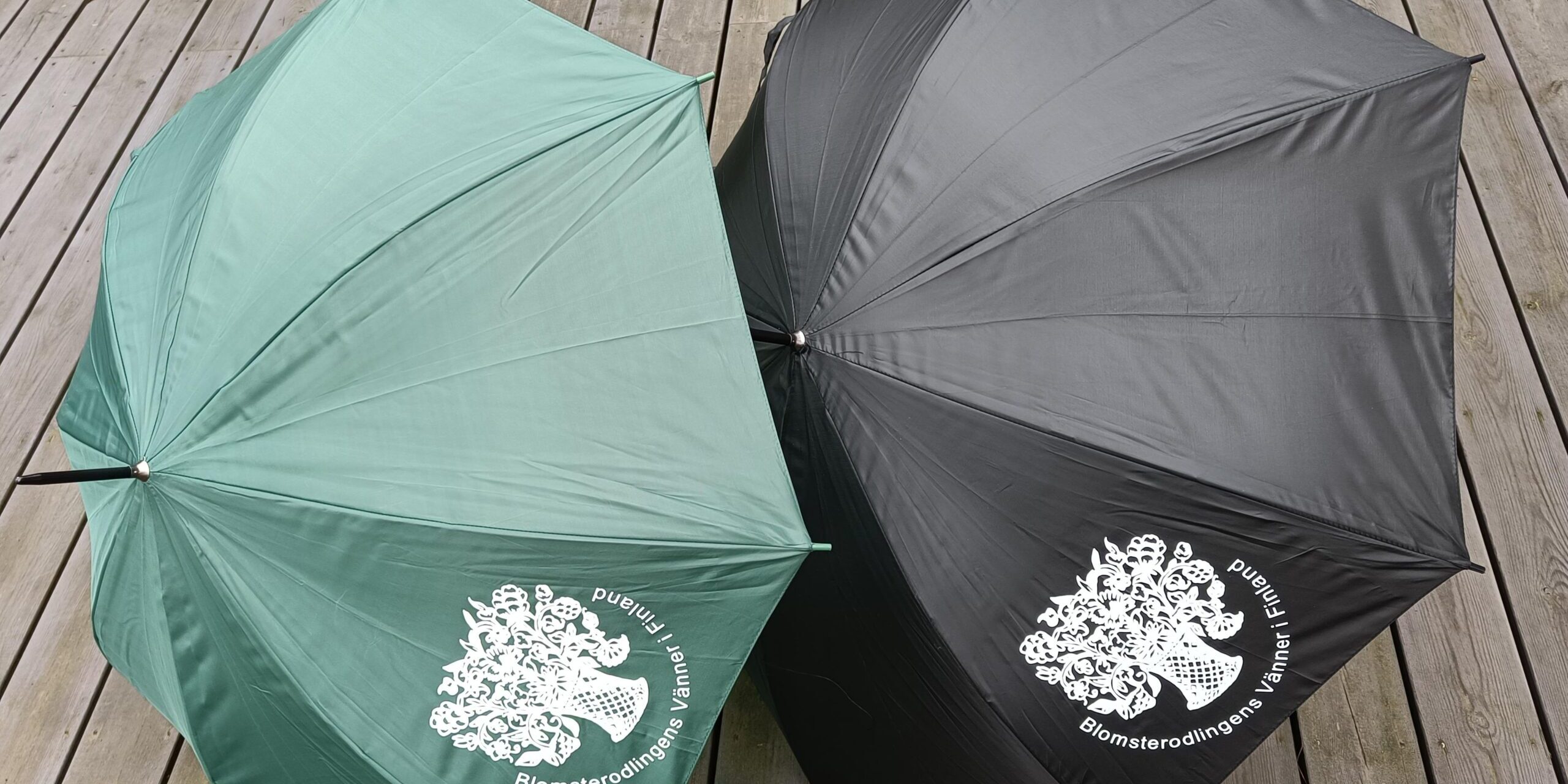 Paraplyerna finns nu i färgerna grönt och svart, senare kommer även rosa paraplyer. De är försedda med föreningens logo samt texten Blomsterodlingens Vänner i Finland i vitt tryck. Priset är 20 euro, och de kommer att finnas till salu på föreningens möten (också julfesten) samt enligt överenskommelse.
